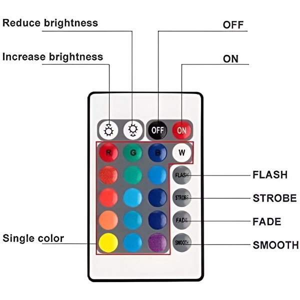 AQUASHEIN je opremljen s priročnim daljinskim upravljalnikom, ki vam omogoča enostavno prilagajanje osvetlitve. S 24 tipkami lahko izbirate med 16 RGB barvami ter štirimi dinamičnimi načini (utripanje, stroboskop, bledenje, gladek prehod). Luči lahko upravljate z razdalje do 10 metrov, kar zagotavlja brezskrbno prilagajanje.