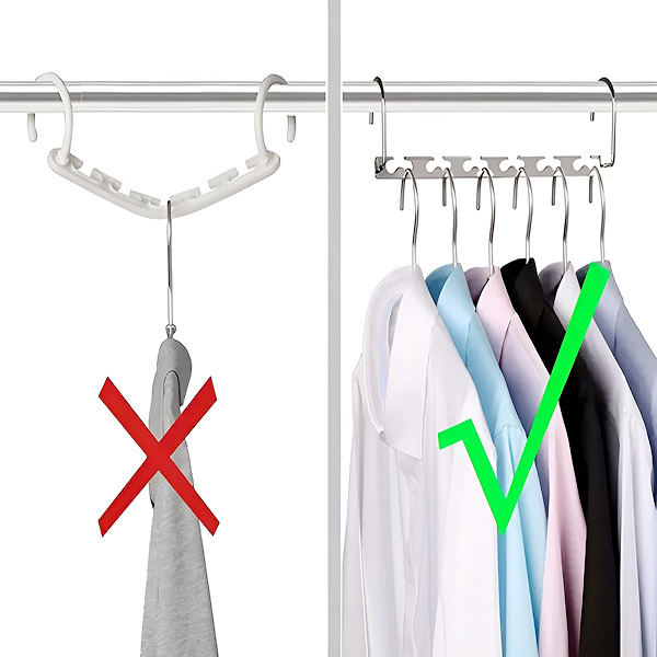Naš obešalnik za oblačila zagotavlja preprosto rešitev, s katero bodo vaša oblačila lepo urejena in brez gub. Ta obešalnik zagotavlja, da ima vsak kos oblačila dovolj prostora, kar preprečuje neželene gube.
